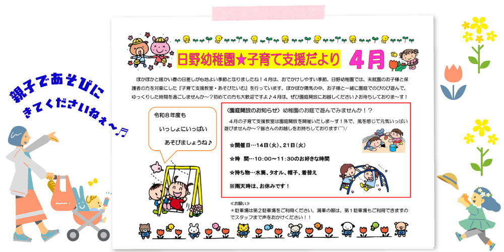 毎月発行している子育て支援だよりです。イベントスケジュール等毎月チェックしてくださいね♪ あそび場紹介♪「日野幼稚園・子育て支援教室」の情報はこちらをみてね♪
