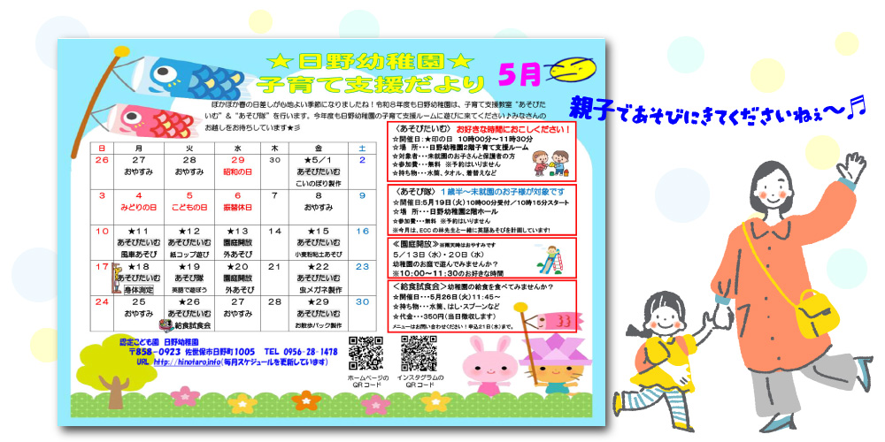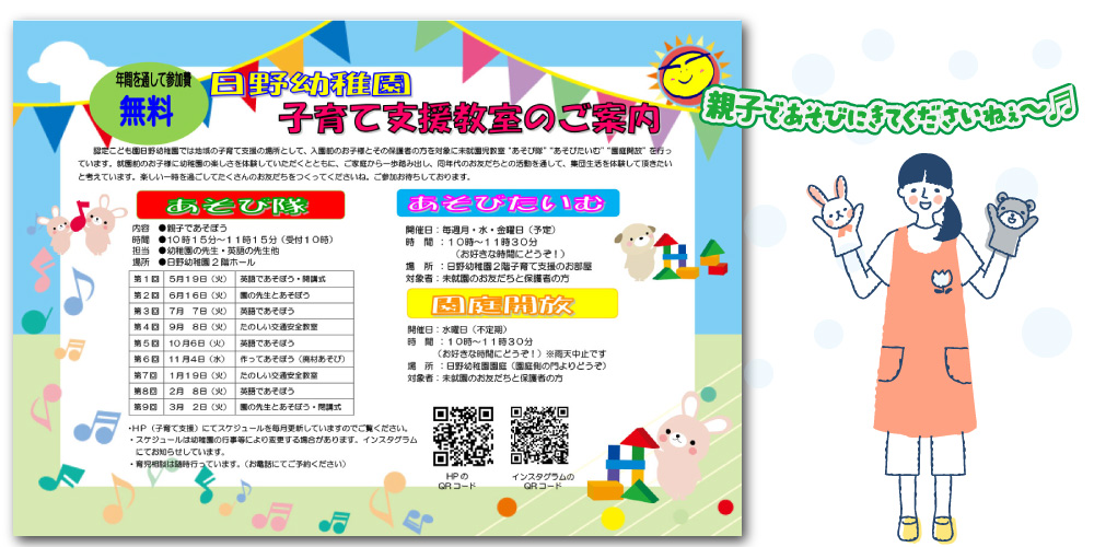 毎月発行している子育て支援だよりです。イベントスケジュール等毎月チェックしてくださいね♪ あそび場紹介♪「日野幼稚園・子育て支援教室」のページをみてね♪ 関連