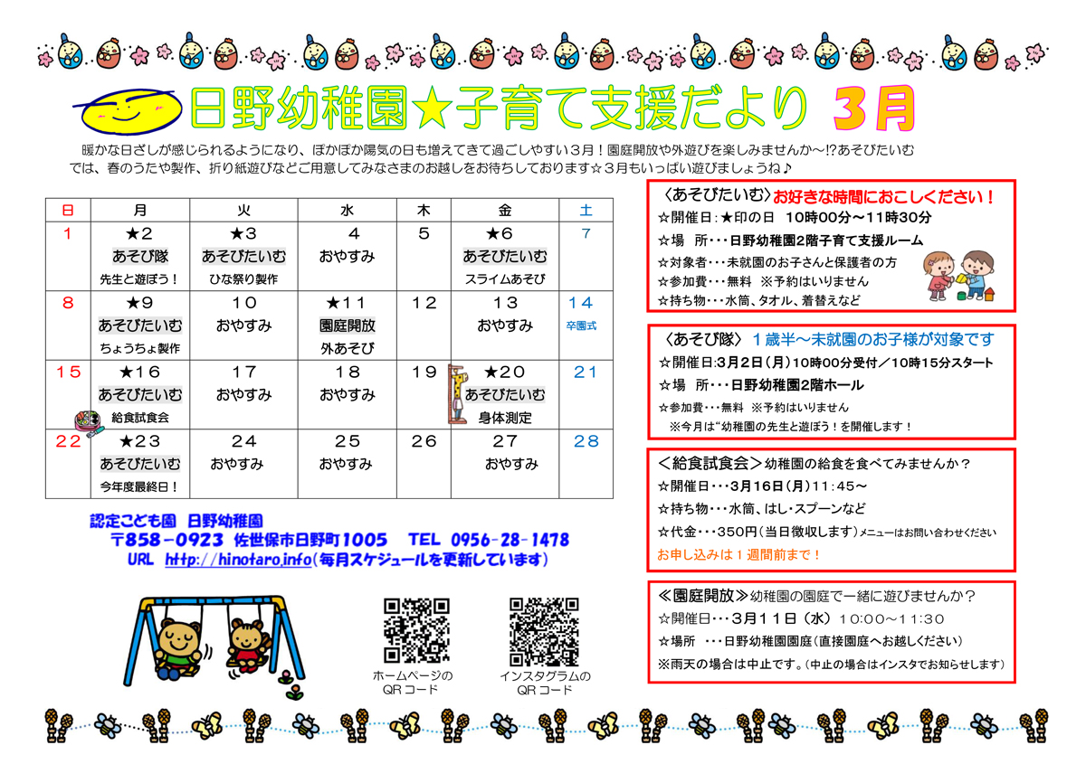 毎月発行している子育て支援だよりです。イベントスケジュール等毎月チェックしてくださいね♪ あそび場紹介♪「日野幼稚園・子育て支援教室」のページをみてね♪ 関連